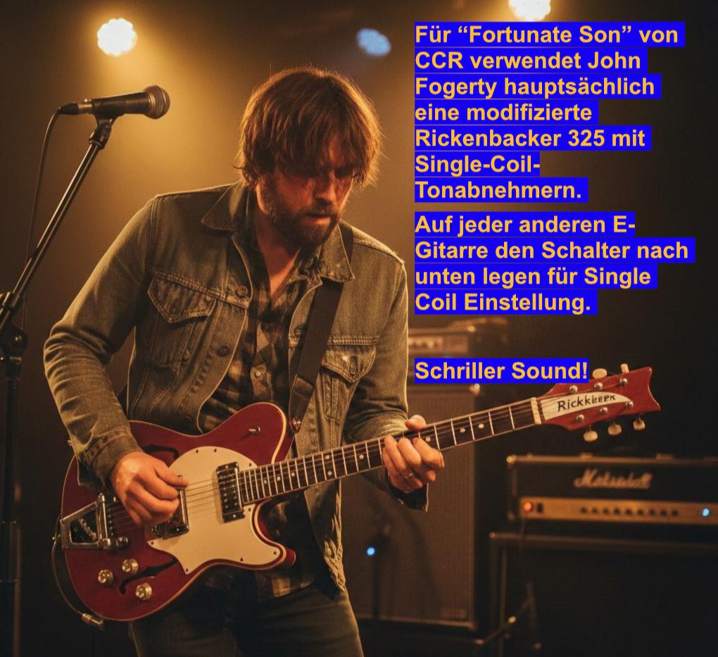 Für “Fortunate Son” von Creedance Clearwater Revival  verwendet John Fogerty hauptsächlich eine modifizierte Rickenbacker 325 mit Single-Coil-Tonabnehmern. Auf jeder anderen E-Gitarre wie z.B. Stratocaster den Schalter nach unten legen für Single Coil Einstellung. Achtung, schriller Sound!