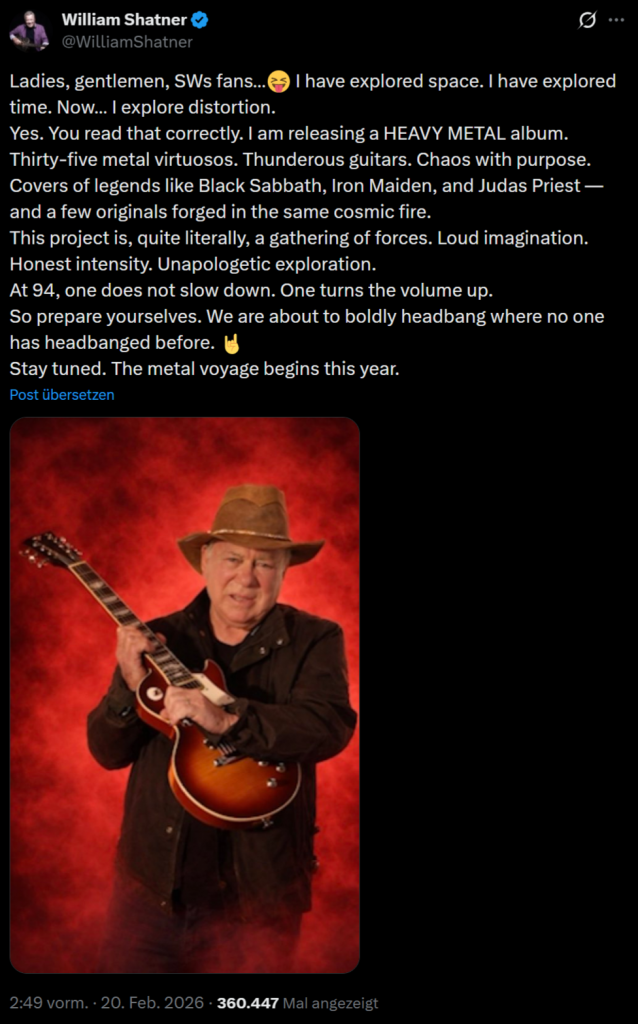 Wann erscheint William Shatners Heavy-Metal-Album? Das Album soll 2026 erscheinen. Ein genaues Datum hat Shatner in seiner Ankündigung vom 20. Februar 2026 noch nicht genannt.