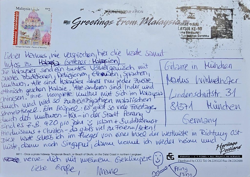 In Zeiten, da Postkarten längst elektronisch ersetzt sind, sammeln wir gerne von Schülern handgeschriebene Grüsse – aus Malaysia, Thailand und wer weiss woher noch. Ab und zu flattert uns eine solche Karte ins Haus, von jemandem der gerade im Urlaub ist oder den Unterricht längst abgeschlossen hat – und sich die Zeit nimmt, uns einen herzlichen Gruß zu schicken. Jede Postkarte kommt an unsere Pinnwand.